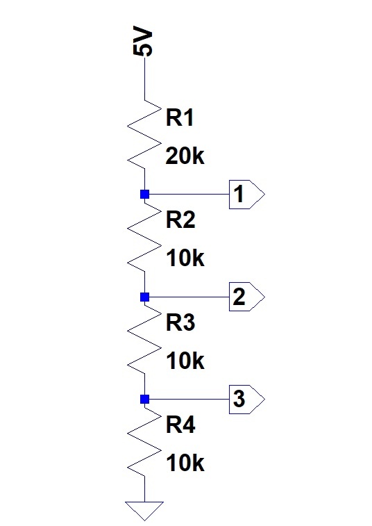 すると1の部分の電圧は5V×(R2+R3+R4)/(R1+R2+R3+R4)=3V