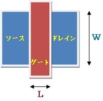 図でいうと横方向に電流が流れます。図で見てもわかる通り、Wが大きいほど横方向の電流はWに比例して多くなります。またLの部分はソースとドレインがもともと導通していないため、Lが小さいほど導通しやすそうだと直感的にもわかります。