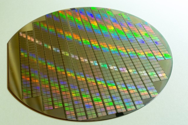 シリコン(Si)は半導体です。半導体集積回路=LSI(IC)です。写真はシリコンウェハと呼ばれるシリコンの板に半導体製造装置と呼ばれる機械で回路を構成したものです。写真に小さな四角が並んでいますが、これが一つ一つバラバラに分割(ダイシング)され、独立したLSIとなります。つまり1枚のシリコンウェハに多数のLSIが作られ、バラバラに切り離して一つのチップになります。これはキラキラしていますが、プリント基板に乗っているものは黒でした。これは黒いパッケージの中に入れられてから、プリント基板に実装されているのであり、パッケージの中には、このキラキラしたシリコンに形成された小さなLSIが入っています。